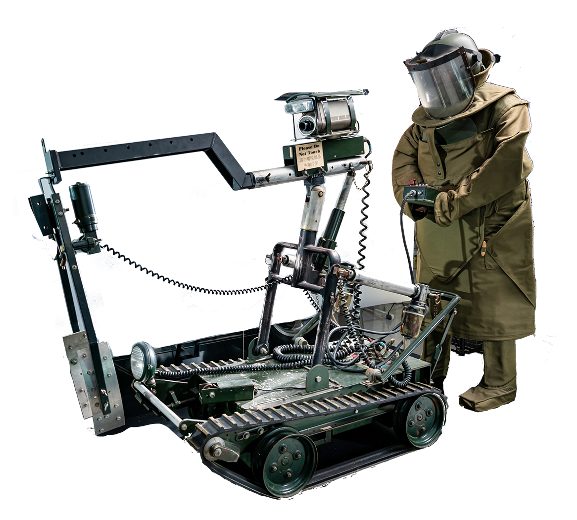 当爆炸品处理课接到紧急任务时,除了出动受过严格训练的拆弹专家外,还有他们的好拍档──炸弹处理车(俗称「拆弹车」)。展品是70年代的拆弹车和防护衣。这款旧式拆弹车型号为 「独轮车马克7号」(Wheelbarrow Mark 7),由英国军队联同当地企业研制而成,主要功用是以机械臂夹起怀疑爆炸品,将之转移到适合位置引爆或作其他处理。拆弹车由人手遥控操作,遥控器与拆弹车之间由一条可延伸100米的电线连接,操作员可以透过拆弹车上的镜头观察爆炸品及现场环境。