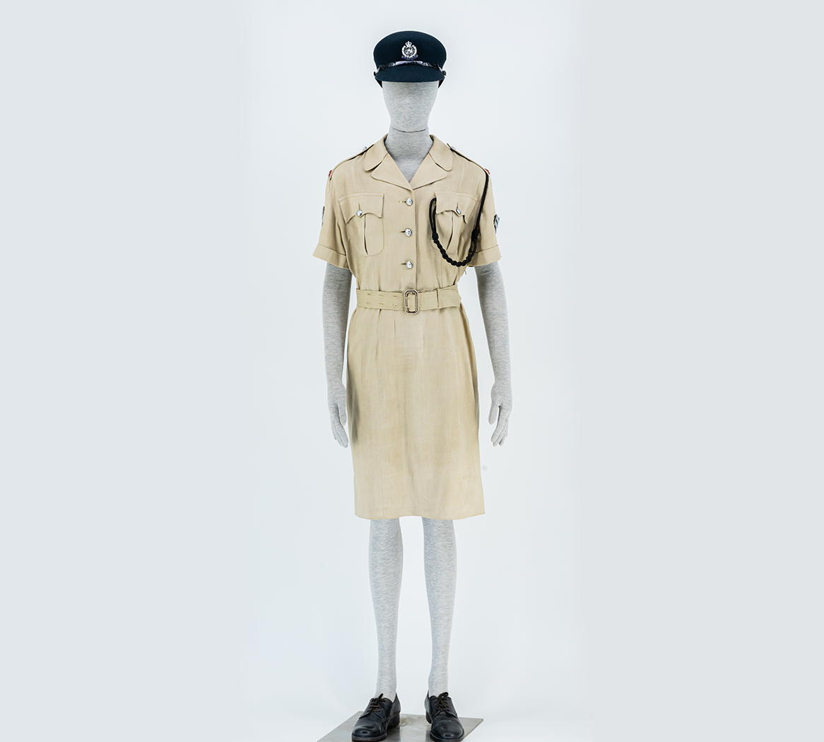 This summer uniform in the linen dress style for female police officers was in use from 1965 until 1987 when it was replaced by the next generation uniform. It was the longest serving uniform. In the early 1960s, the number of female police officers burgeoned. Women joining the Force began to be attached to different units and specialised departments. They were no longer confined to office clerical duties and dealing with women and children. Their duties increasingly diversified to include directing traffic, patrolling in uniform, crowd management, criminal investigation, etc. A review of the uniform for female officers was initiated to design a uniform to meet the changing needs of their work that was both convenient and attractive.